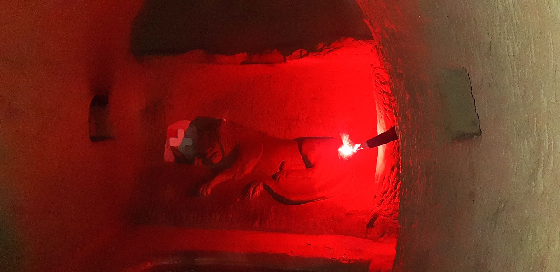 Bald konnte die erste Gruppe mit Helm und Lampen ausgerüstet ins Bergwerk einsteigen. Niemand konnte sich vorstellen, dass hinter einem kleinen Tor und unter einem niedrigen Hügel so ein grosses Sandbergwerk verborgen ist.
